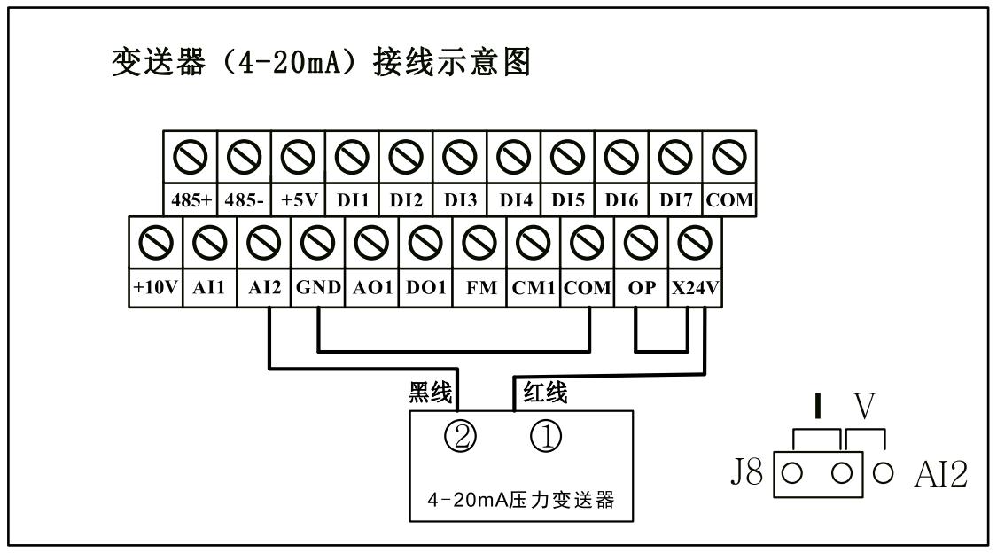 4-20mA變送器反饋模式,需要把綠色端子上的GND和COM用導(dǎo)線(xiàn)短接,變送器的正端接X(jué)24V(或者和X24V短接的OP),信號(hào)線(xiàn)接AI2。如下圖所示。